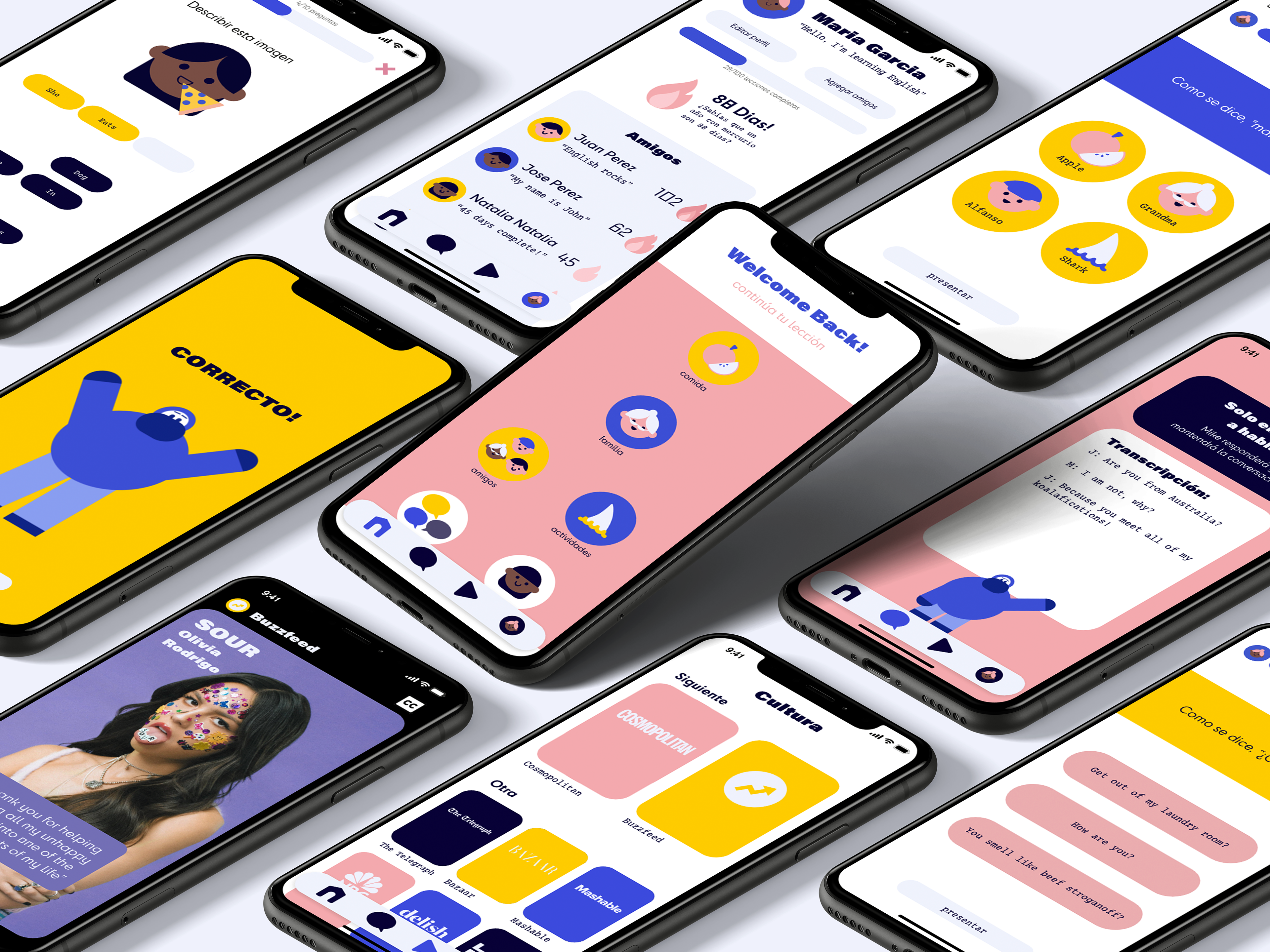 The assignment for this project was to follow three parameters when creating our app; the app needed to be a language learning service, the audience needed to be english language learners and the final product needed to be "quirky". This project was a joint project between myself, Michelle McDonald, and Mac Jiran. My primary role included picking the color palette, icons and basic shapes within the app design, as well as designing the culture pages and profile page.